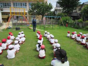 まずは、外遊びの時に僕が不審者役で変装して侵入し