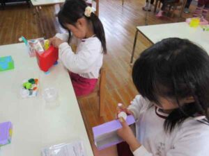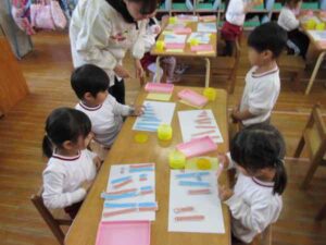 ほし組さんは昨日に続いて「お店屋さんごっこ」の品物作りをしていました。