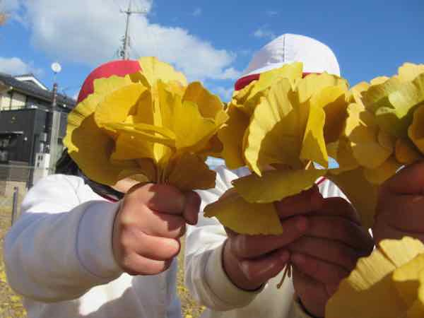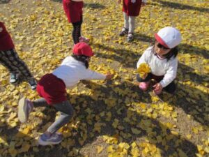 昨晩からの風で、たくさんの葉っぱが園庭に落ちていました。