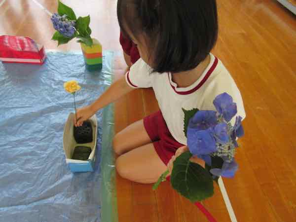その後、つき組さんはみんなが持ってきてくれたお花を使って“生花”を行いました。