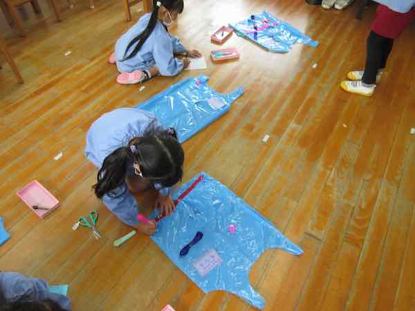 ビニールの服に、リボン・ビニールテープ・折り紙などなどを使って