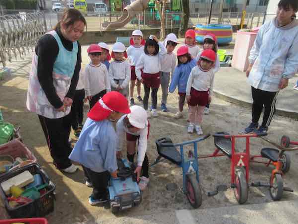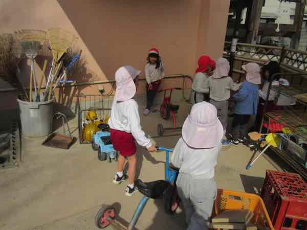 三輪車やスクーターなどは、つき組さんのお当番が片付けます。