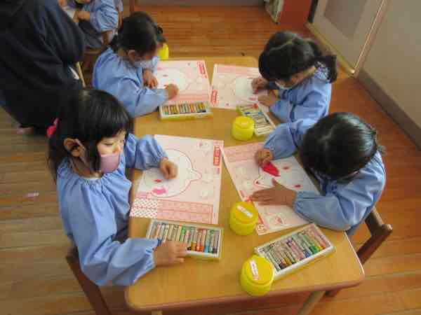 今日のはな組さんは「たのしいせいさく」で鬼のお面を作っていました。