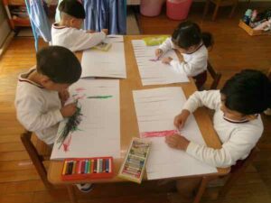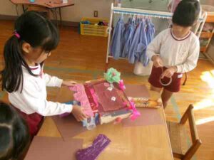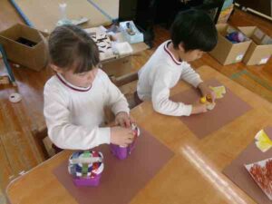 つき組さんは「お店屋さんごっこ」に向けて“ロボット”を作っていました。 ペアになって作業を進めるのですが、 普段関わりの少ない子などでペアを組むことで、 新しい友だち関係も生まれているようです。 作業では、まず設計図を描いて進めるのですが、 ペアで使う材料などを相談しながら取り組んでいましたよ! 楽しく作ることだけでなく、 その過程を通して、多くのことを学んでもらえたらと思います!