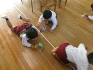 ほし組さんは「たのしいせいさく」で“フーフーボート”を作りました。 息を吹いて進むボートなのですが、 今日は、ハサミの使い方に気をつけて取り組みました。 みんな上手に線の上を切ってくれて、 好きな色に塗っていました。 完成した後は、みんなで息を吹いて進めて、 競争などをして盛り上がっていましたよ!