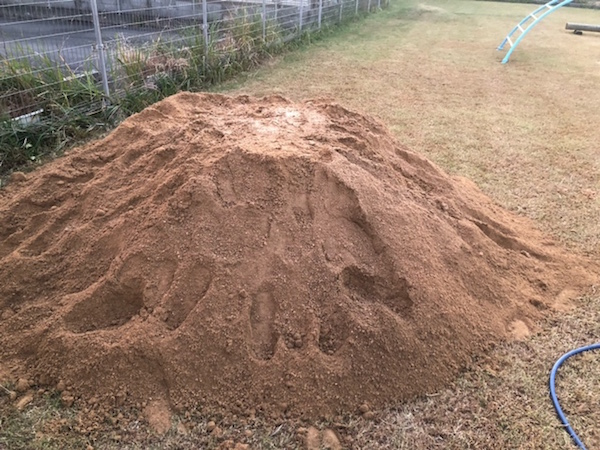 今日の夕方、園児のお父さんが芝生の園庭に「土山」を作ってくださいました。 現在、園舎側の園庭が工事で使えないので、 土を使ったおままごと等ができずに困っていました。そこで相談をして真砂土を持って来て頂きました。 ご協力頂いたお父さん有難うございます!! 明日、園児が喜ぶ笑顔が早く見たいです!!