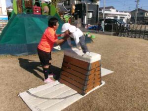 “跳び箱”では、みんなしっかりとスピードに乗って踏み切れて、