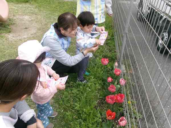 チューリップなどを見つけて、嬉しそうにシールを貼っていましたよ!
