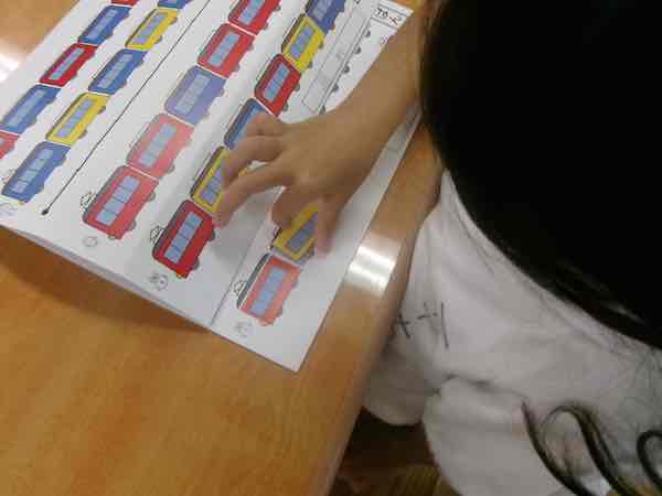 見本にある通りに、色々な色の電車を並べるという課題でした。