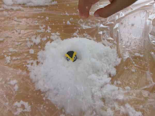 魔法の粉に水をかけると、雪のように固まって、