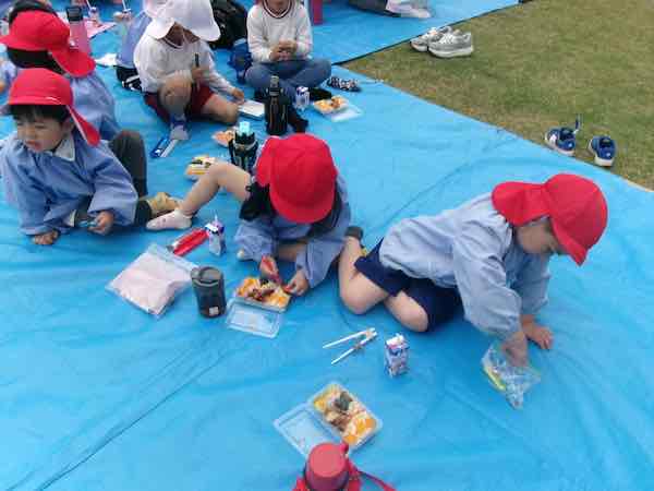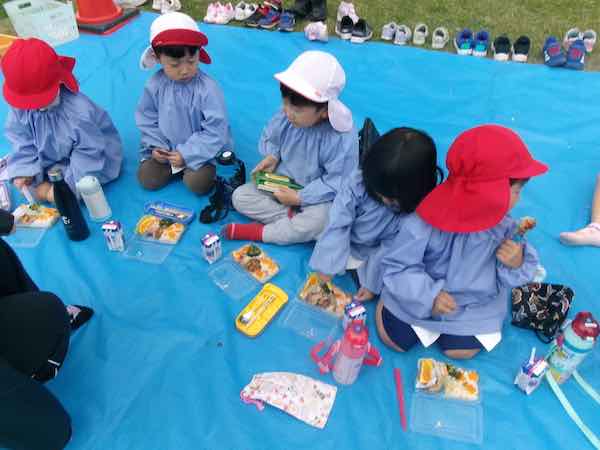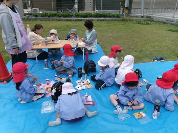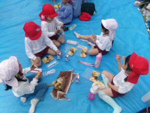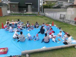 今日は幼稚園全体で給食を園庭で食べる